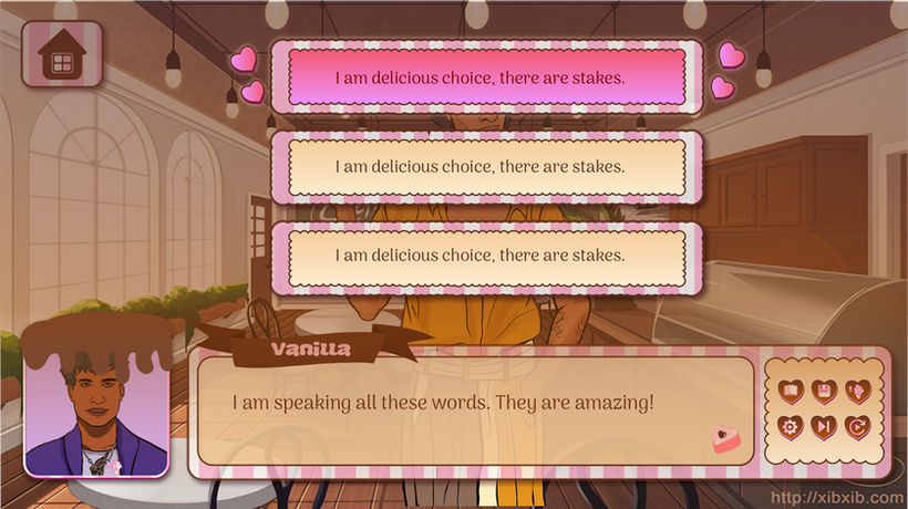 Sweet Valentine Chocolatier was a light hearted otome dating sim and visual novel released for a several game jams in 2025. This was a commissioned piece. I worked as the team's GUI designer and also created the logo for the game. Chocolatiers, bakeries, sweets, and mobile puzzle games inspired the visual aesthetic.