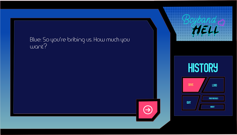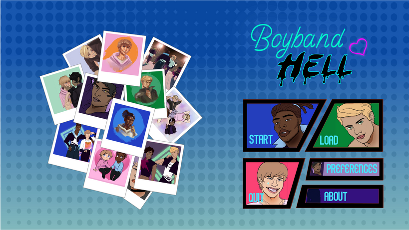 Boyband Hell is a dating sim visual novel released for a game jam in 2023. I worked as the team's GUI designer and also created the logo for the game. The design elements were inspired by Sci-Fi aesthetics and included bright, neon, punchy colors. I also created custom illustrations and vector drawings included for the buttons.